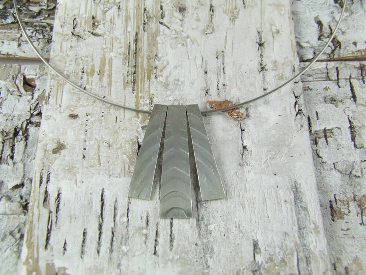 3-Delige zilveren hanger aan een staalkabelcollier met zilveren bajonetsluiting. Lengte collier: ca. 43 cm.
