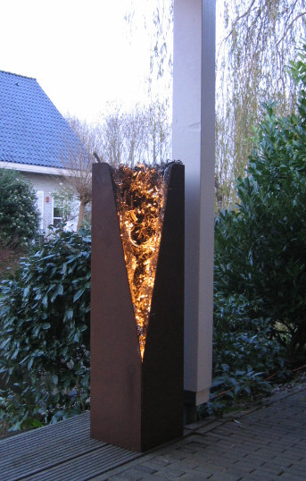 Geroest metalen beeld met aan de binnenzijde roestvrijstaal. Onderin een lamp. In verschillende afmetingen leverbaar.