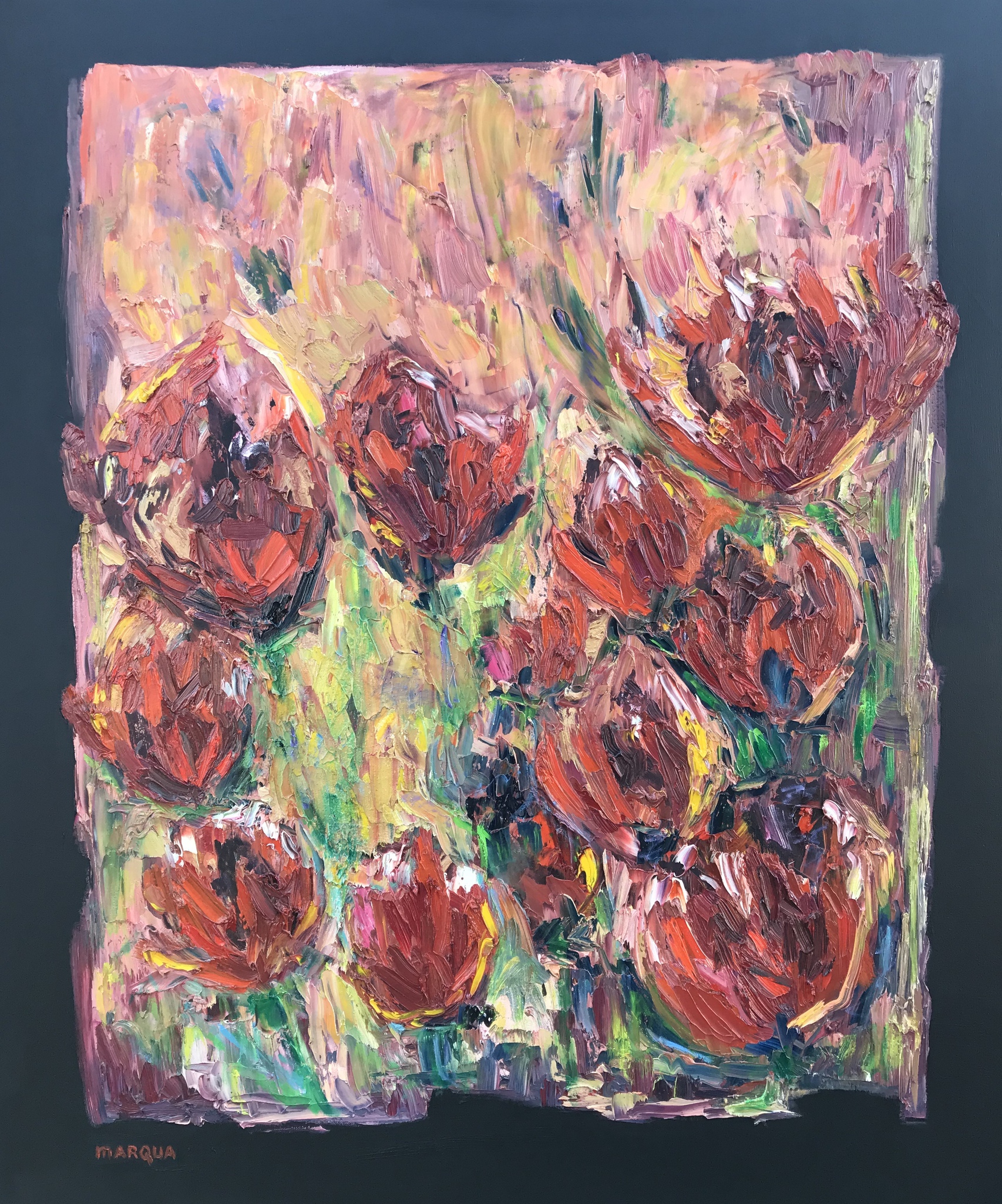 Bloemachtigen rood paars op zwart venster, geschilderd in acryl- en dikke lagen olieverf en kaoline (=porseleinpoeder) op "3-d" doek 100x120x4