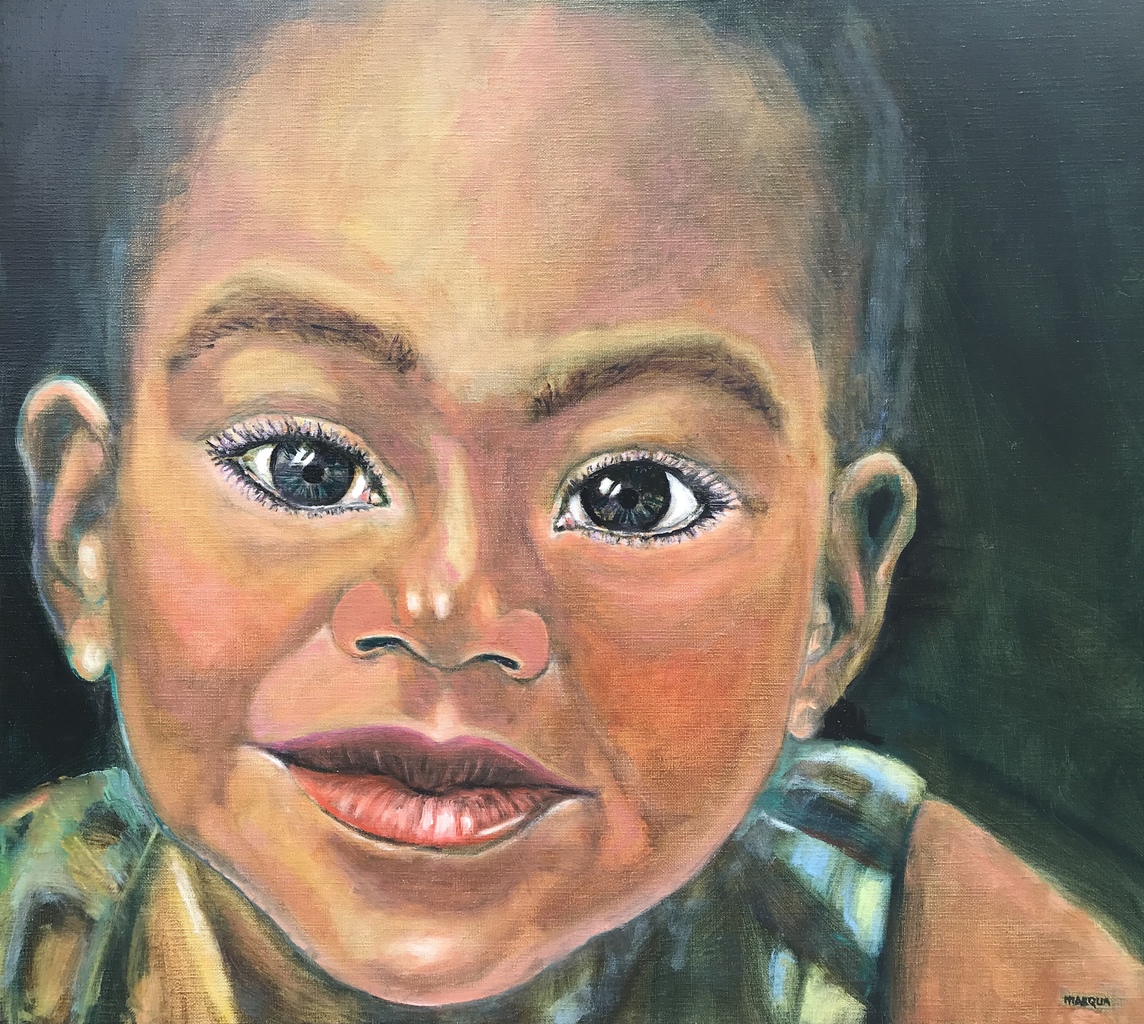 Portret kind met bruine ogen, geschilderd in olieverf op linnen doek 80x90 cm.