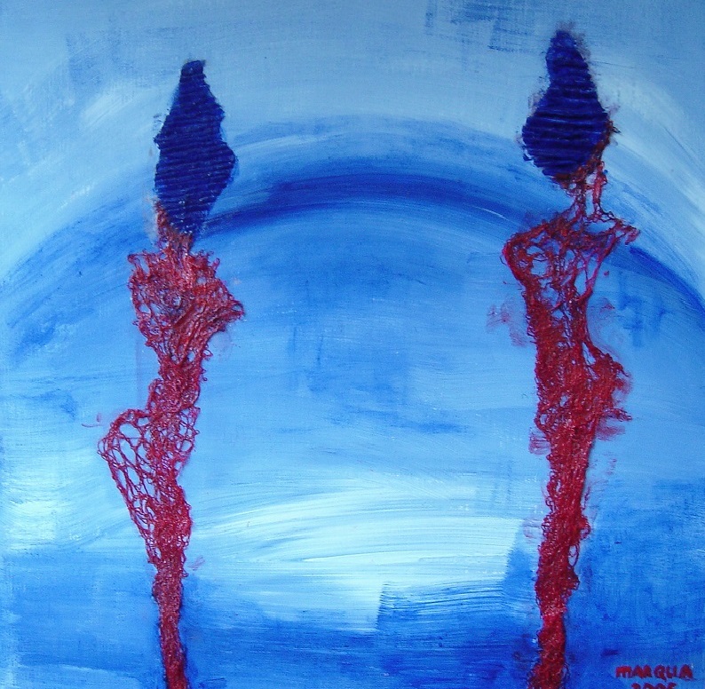 Persoon met kind in water blauw / twee vrouwen , geschilderd in acrylverf in gemengde technieken op "3-d" doek 30x30x4 cm. Eventueel ook mogelijk als tweeluik samen met MARQUA537, persoon met kind in water rood.