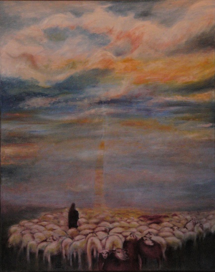 schapen integreren mij en d.m.v. de lucht op een speciale wijze neer te zetten, geeft dit een speciale dementie aan dit schilderwerk. (olieverf)