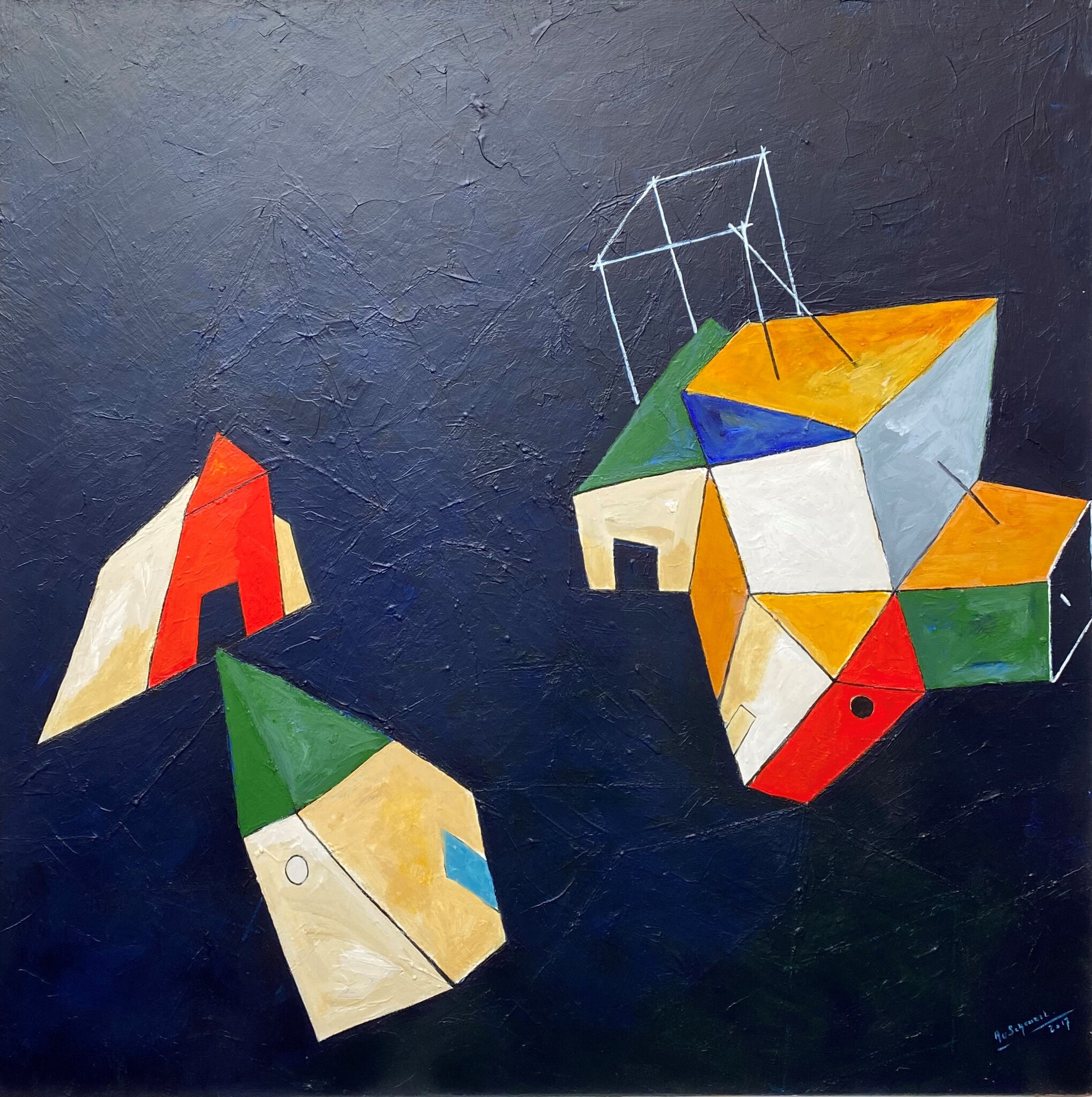 Wit Geel Blauw Acryl Yellow Blue Canvas Red Green Acrylic White Dorp Linnen Lijnen Huizen Stadsgezicht Blokken Geometrisch Verbinding Geometrical Bleu Dark Houses Village Connection