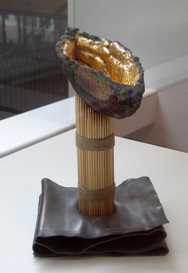 santuary, hold your heart in your hands; raku, bamboe,vlas lood, blad goud