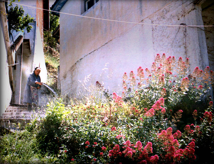 Bloemen Sproeien Water Slang Vrouw Bergdorp Cyprus Europa Documentair Sociaal Portret Kleur