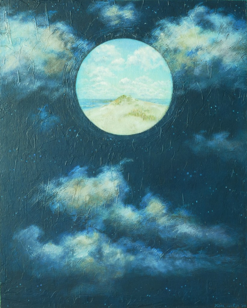 Mijn schilderijen gaan over menselijke emoties, innerlijke conflicten en stemmingen die in symbooltaal zijn teruggebracht tot kernachtige beelden. Deze zijn verstild, ruimtelijk en ietwat surreëel.Vaak wordt ook de lijst en het passe-partout erbij betrokken om maximaal uit te drukken wat ik wil zeggen. Soms gebruik ik gordijntjes of luikjes: als ze dichtgaan wordt het een ander schilderij. Poortjes, luikjes, drieluiken, maar ook “zesluiken” (voor- en achterkant van een drieluik beschilderd) kenmerken vaak het werk van Hilde van Eijk en versterken de zeggingskracht waardoor je a.h.w. een tweede werkelijkheid binnengaat. Er zijn hierbij verschillende mogelijkheden om het schilderij te etaleren, zodat steeds op een verrassende manier een ander schilderij ontstaat. Gladde oppervlakten va