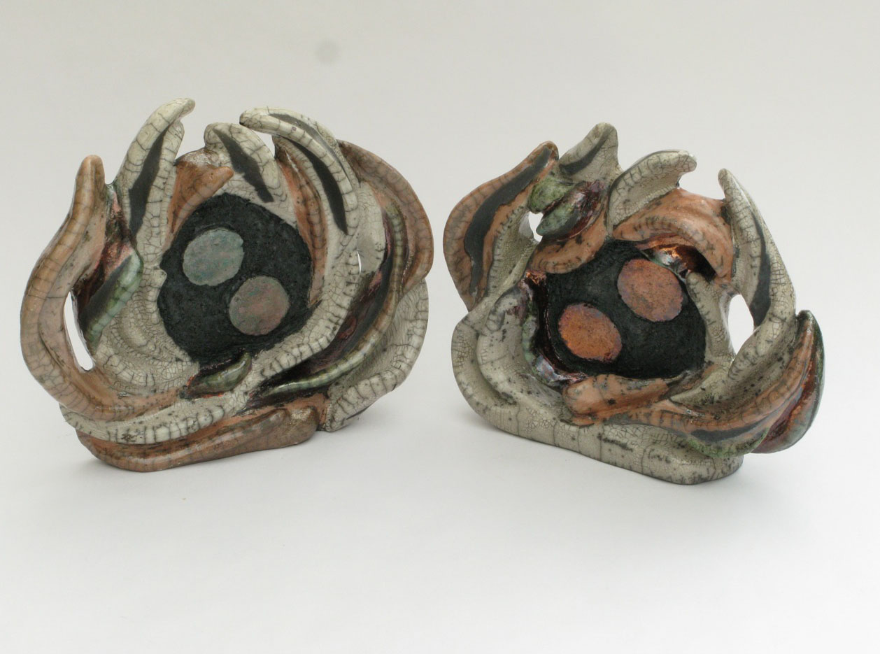 "Dansen om de kern/de basis". In opdracht gemaakte objecten ter gelegenheid van jubilerende bestuursleden/oprichters van een jazzdansvereniging.(Raku)
