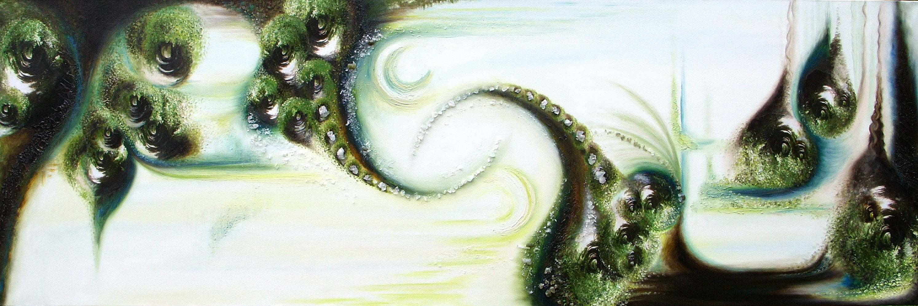 Laatste werk.... magisch midden... de complete verbinding liet lang op zich wachten... de verf blijft meer dan 6 maanden nat...in afwachting van wat??? Nu is het werk ingelegd met edelsteentjes en heb ik mogen zien wat dit werk verbeeldt. Zie verdere uitleg op http://www.pan-holland.nl/Wavespeller/4KANjaar_10.htm onder het kopje "Kunst in het licht".
