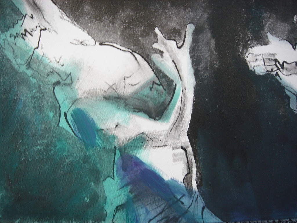 Abstracte dans inkt 2, getekend en geschilderd met rietpen en penseel en aangevuld met olieverf op "3-d" doek 24x30x4 cm. Zwart, wit, groen, blauw en paars.