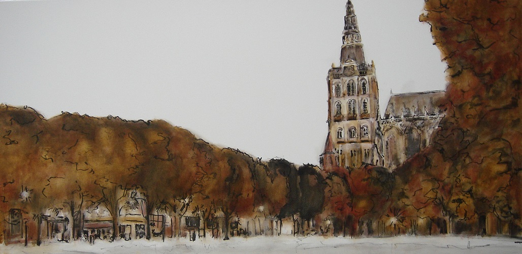 Sint Jan aan de Parade te 's-Hertogenbosch. Getekend en geschilderd met rietpen, tekenpen en penseel met drie kleuren inkt: Oost-Indische inkt en bruine en rood-bruine tekeninkt op doek 120x60 cm.
