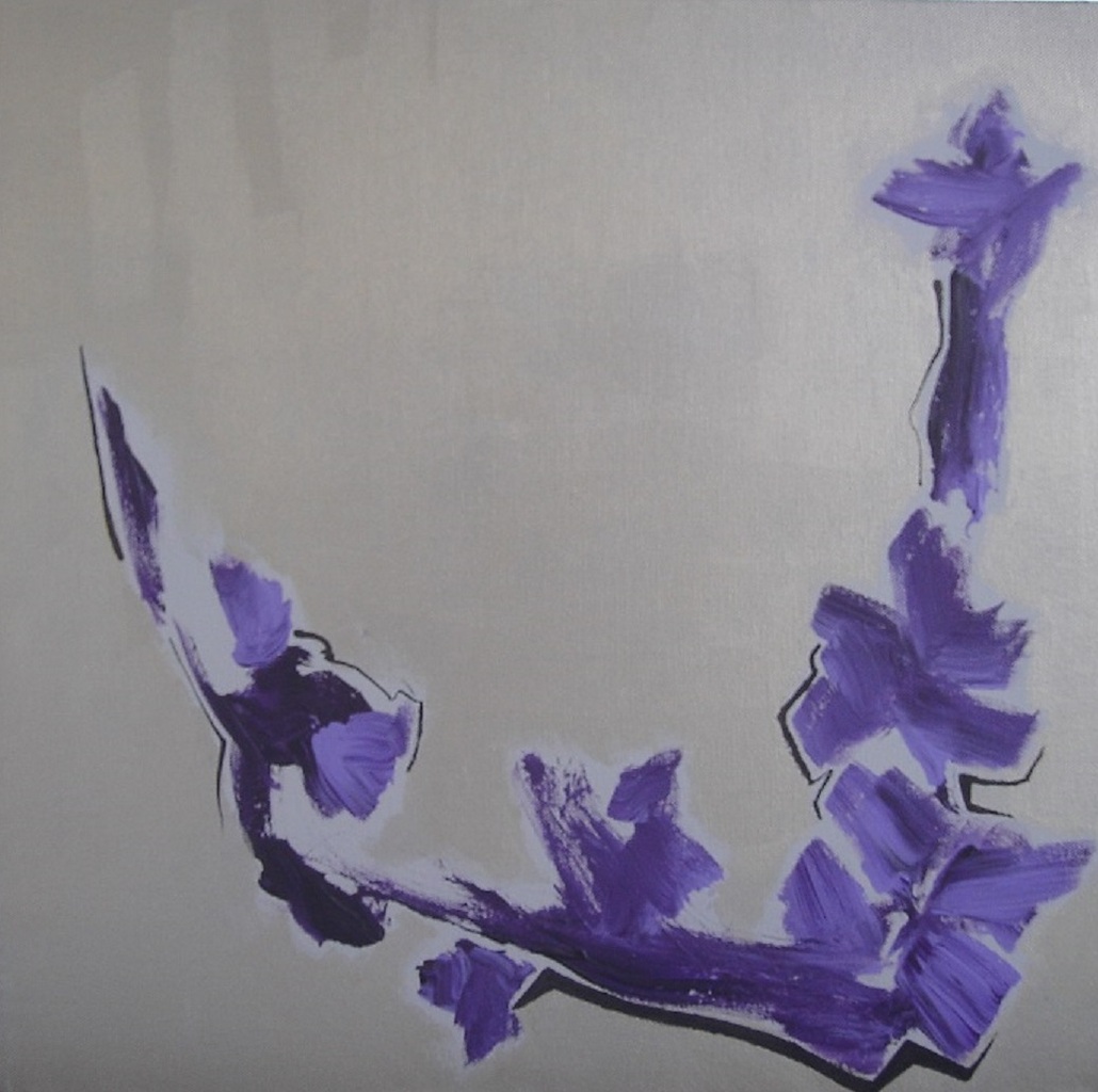Abstract inkt, blauw/paars en zilver. getekend in Oost-Indische inkt, aangevuld met acrylverf op doek 60x60 cm.