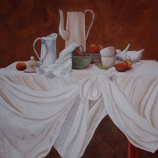 Eileen Engels (1946),In 2003 ben ik gaan schilderen en heb wat basislessen gevolgd op een schildercursus.Eigenlijk ben ik dus autodidact en geinspireerd door de Noord Nederlandse realisten Henk Helmantel,Ben Snijders.Ik schilder ook in opdracht.Het schilderen van stillevens is mijn grote passie.Sinds 3 jaar exposeer ik ook aan huis tijdens een open atelierroute 'Waardart' in de Betuwe.Deze atelierroute wordt altijd in het laatste weekend van september en in het eerste weekend van oktober gehouden.