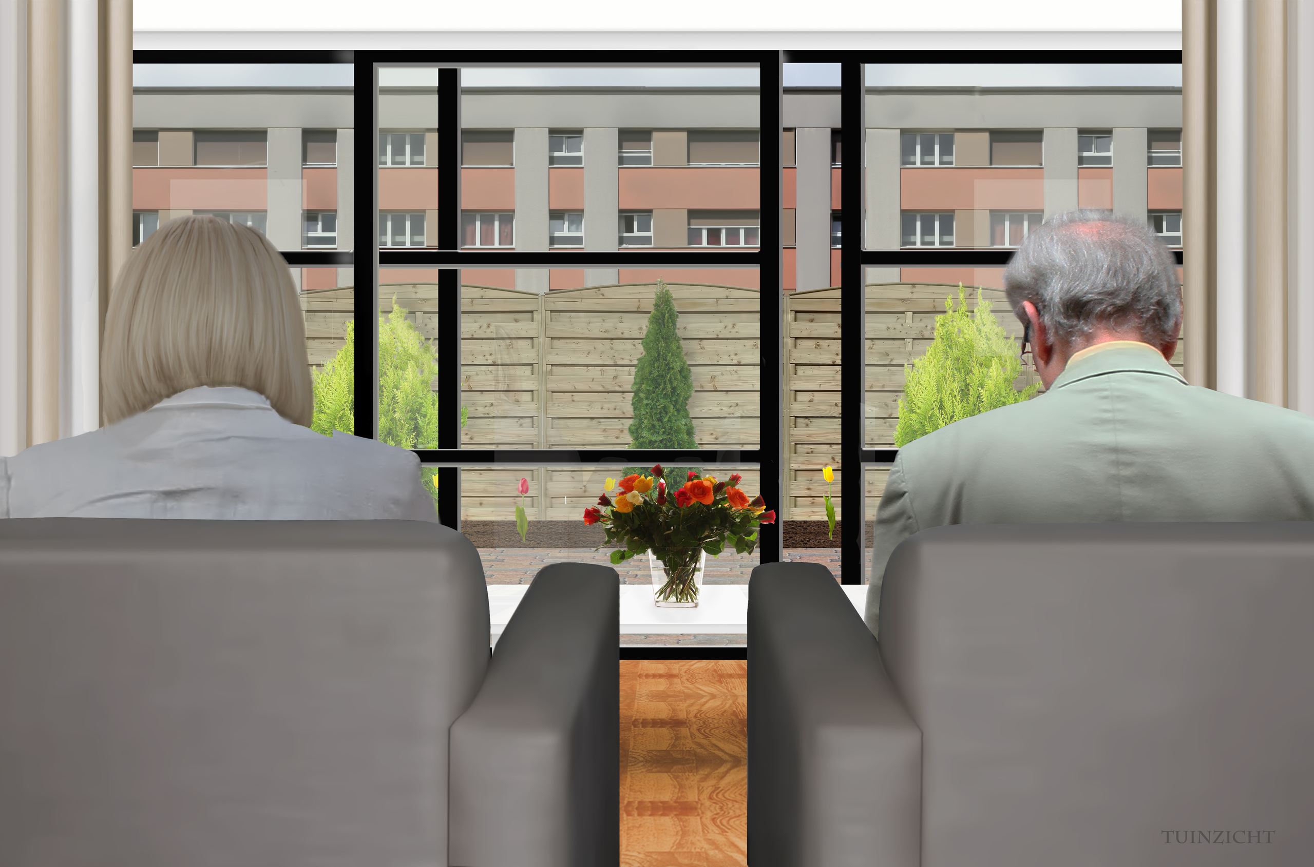 Een man en een vrouw in hun stoel. De man leest een boek en de vrouw kijkt naar de tuin.