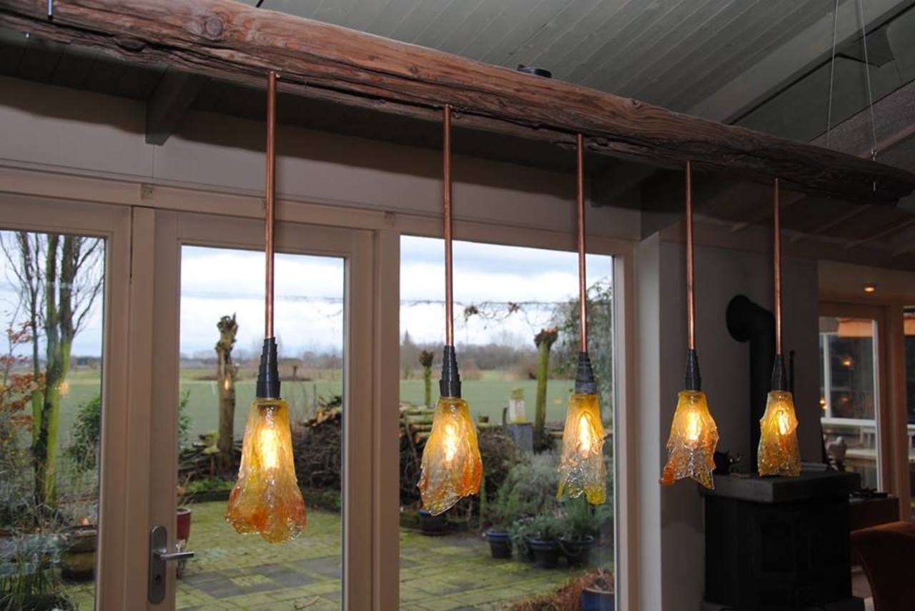 Hanglamp met wrakhout, frame van koper en lood, kapjes van gefused glas.
