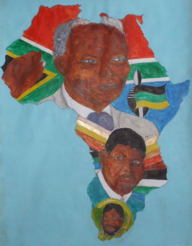 3 portretten Mandela opeenvolgend, laatste gebalde vuist en vlag ANC binnen Afrika verbeeld.