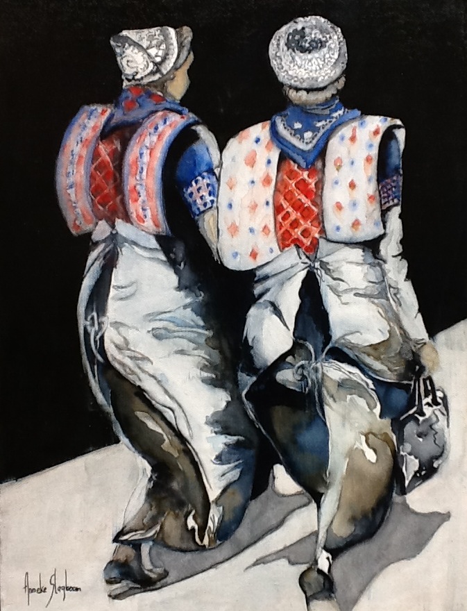 Anneke Slagboom (1962) woont in Ridderkerk en heeft de opleiding voor docente textielewerkvormen gevolgd. Het vormgeven en ontwerpen staat centraal in haar leven. Anneke is autodidact. Ongeveer 10 jaar geleden begon het schilderleven met een aquarelcursus maar al snel was daar behoefte aan meer: acryl. Vele cursussen volgden bij verschillende kunstenaars en Anneke is inmiddels zelf docente aan de VU in H.I. Ambacht. Beide technieken blijven boeien. Soms komen ze samen in 1 werk. Waar aquarel een geduldig en precies werkje is, kwamen bij acryl de snelle en impulsieve kant aan bod. Ondergronden worden bewerkt, paletmes wordt gebruikt en grote kwasten zijn favoriet. Maar altijd is er wel dat punt waar er gedetailleerder gewerkt gaat worden. De sfeer van het schilderij is het belangrijkste.