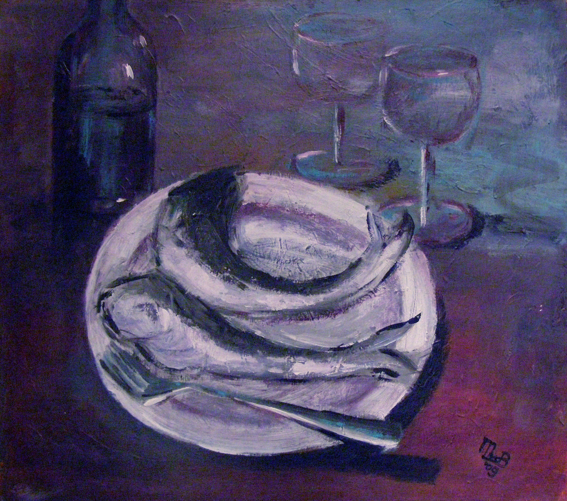 stilleven met haringen en wijn in paars