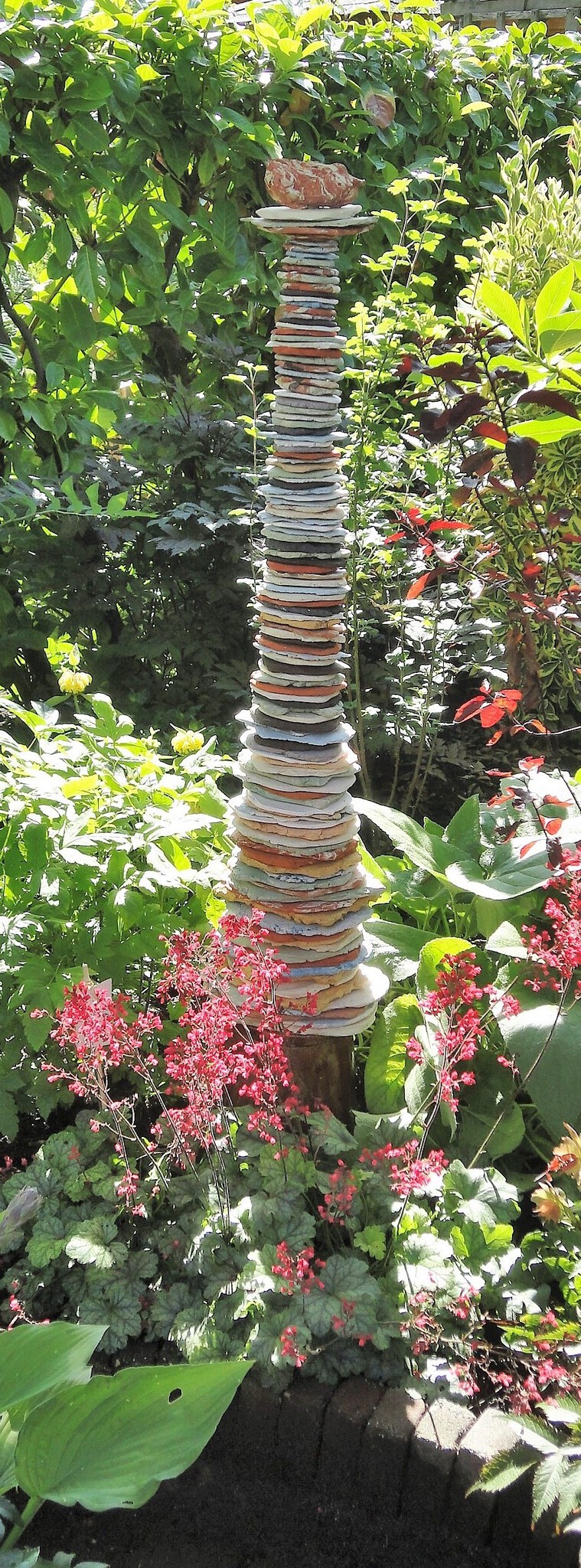 Gestapelde kleimonsters van diverse kleisoorten met oranje/rood voetstuk.
