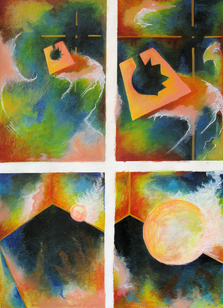 Kleurrijk,gevoelig, intuitief in combinatie met bedachtzaamheid, ruimtelijk, lijn, driehoek en bolvorm.