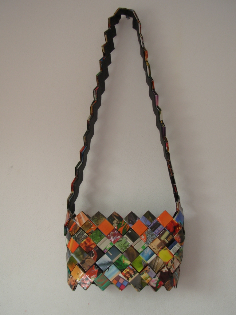 Tas die gemaakt is van repen van vrolijk gekleurde bladzijden uit tijdschriften, die inelkaar zijn gevlochten. Waterdicht dankzij een vernislaag.