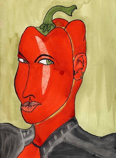 De paprika tot kunst verheven in een portret! Gemengde techniek Aquarel/ pen