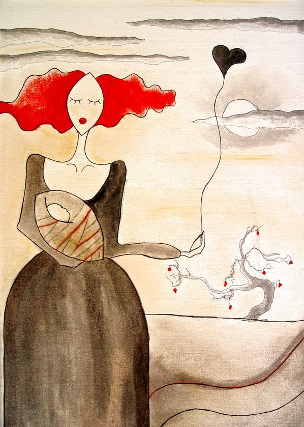 Dit schilderij symboliceerd de liefde van een moeder met een gouden hartje. Ook heb ik dit laten zien bij de boom. Eigenlijk is hij dood maar wanneer zij langs liep liet ze hem weer opbloeien. Maar ze was zo goedaardig en lief dat de vruchten door haar smolten.