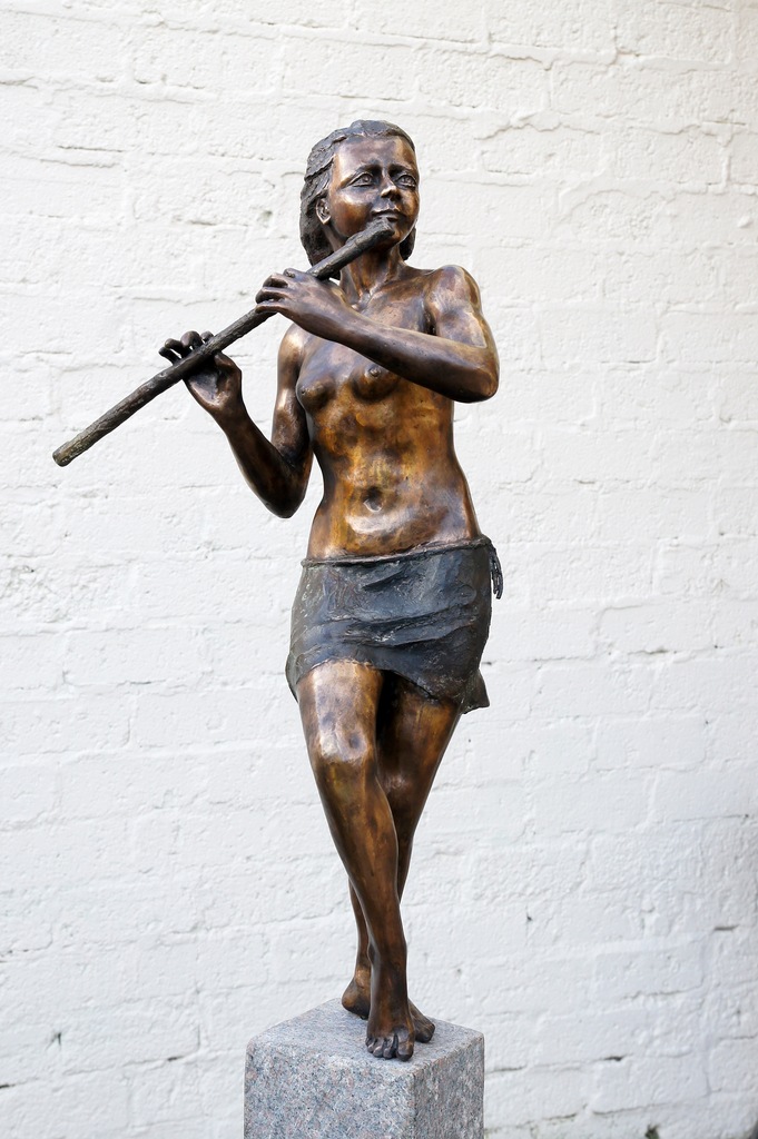 De fluitspeelster (dwarsfluit) van brons op sokkel van graniet, totale hoogte 152cm
