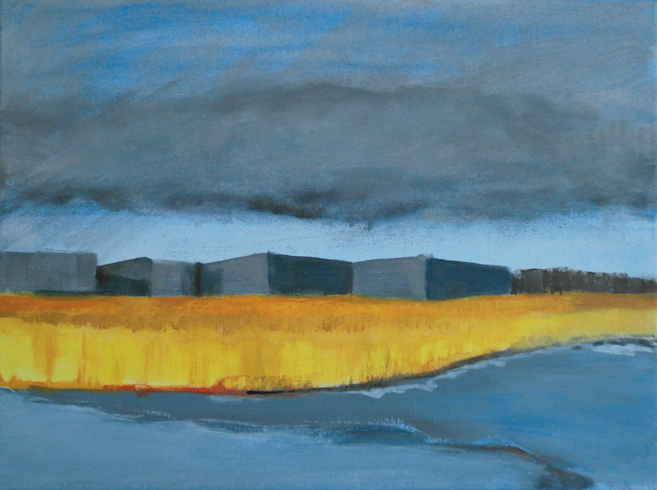 Landschap Stad Bedrijven Regen Wolken Geel Blauw Acryl Graan Stadsrand