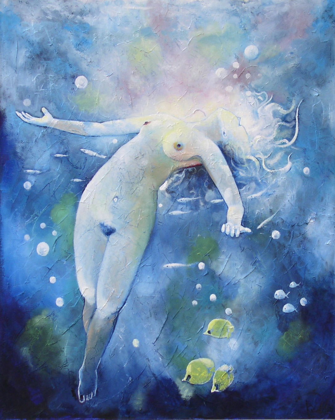 Wit Zwart Blauw Mystiek Groen Vrouw Water Licht Sfeer Vissen Rust Overgave Zweven Koraal Onder Geeloranje Genieten Aanraking Anemoon Duiken Ontspanning Sereniteit Losjes