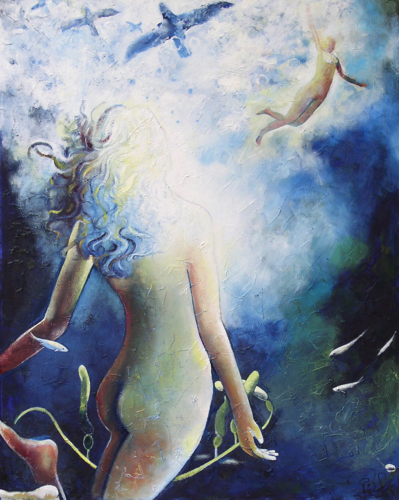 Wit Zwart Blauw Mystiek Groen Vrouw Water Licht Sfeer Vissen Vogels Rust Overgave Zweven Koraal Onder Geeloranje Genieten Anemoon Duiken Ontspanning Sereniteit Losjes
