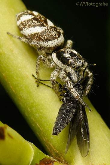 deze zebraspin(harlekijn) doet zich tegoed aan een prooi