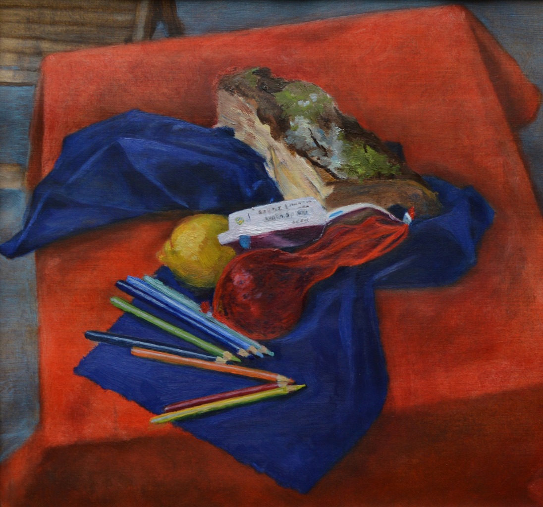 stilleven met potloden, ui, citroen, houtblok en doeken