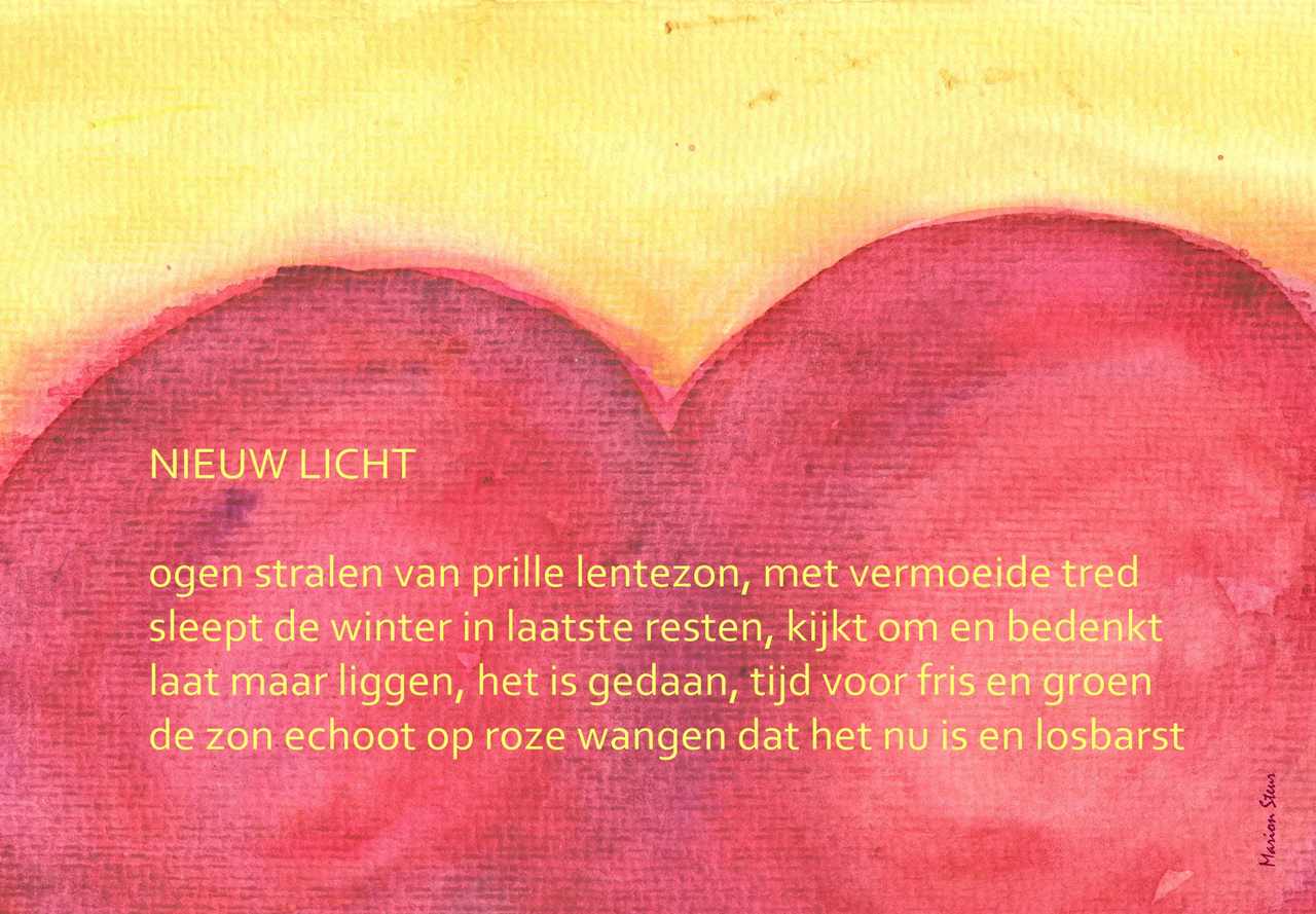 NIEUW LICHT ogen stralen van prille lentezon, met vermoeide tred sleept de winter in laatste resten, kijkt om en bedenkt laat maar liggen, het is gedaan, tijd voor fris en groen de zon echoot op roze wangen dat het nu is en losbarst gedicht op digitaal bewerkte aquarel oplage van 10 stuks in formaat en op materiaal naar keuze ook verkrijgbaar als anischtkaart