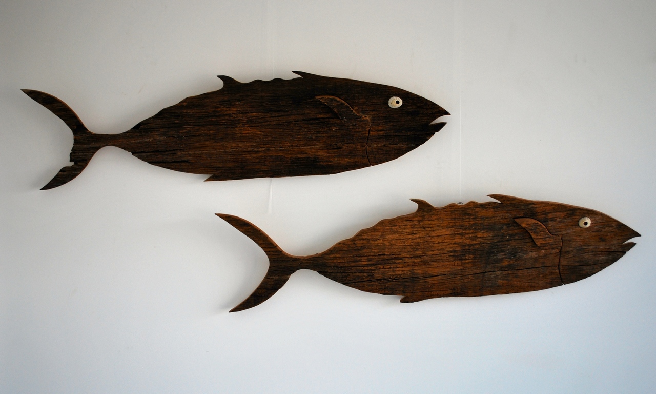 Yellow fin Tuna 2 big en very old driftwood fish