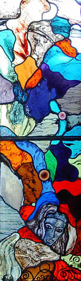 De muzen 3c, bert cox (1966). Glasschilderkunst; gebrandschilderd glas -in-lood Tekeningen in houtskool en andere media.