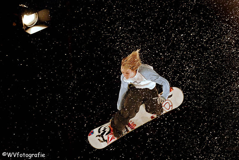 Snowboarder in actie op een overdekte kunstsneeuw-schans