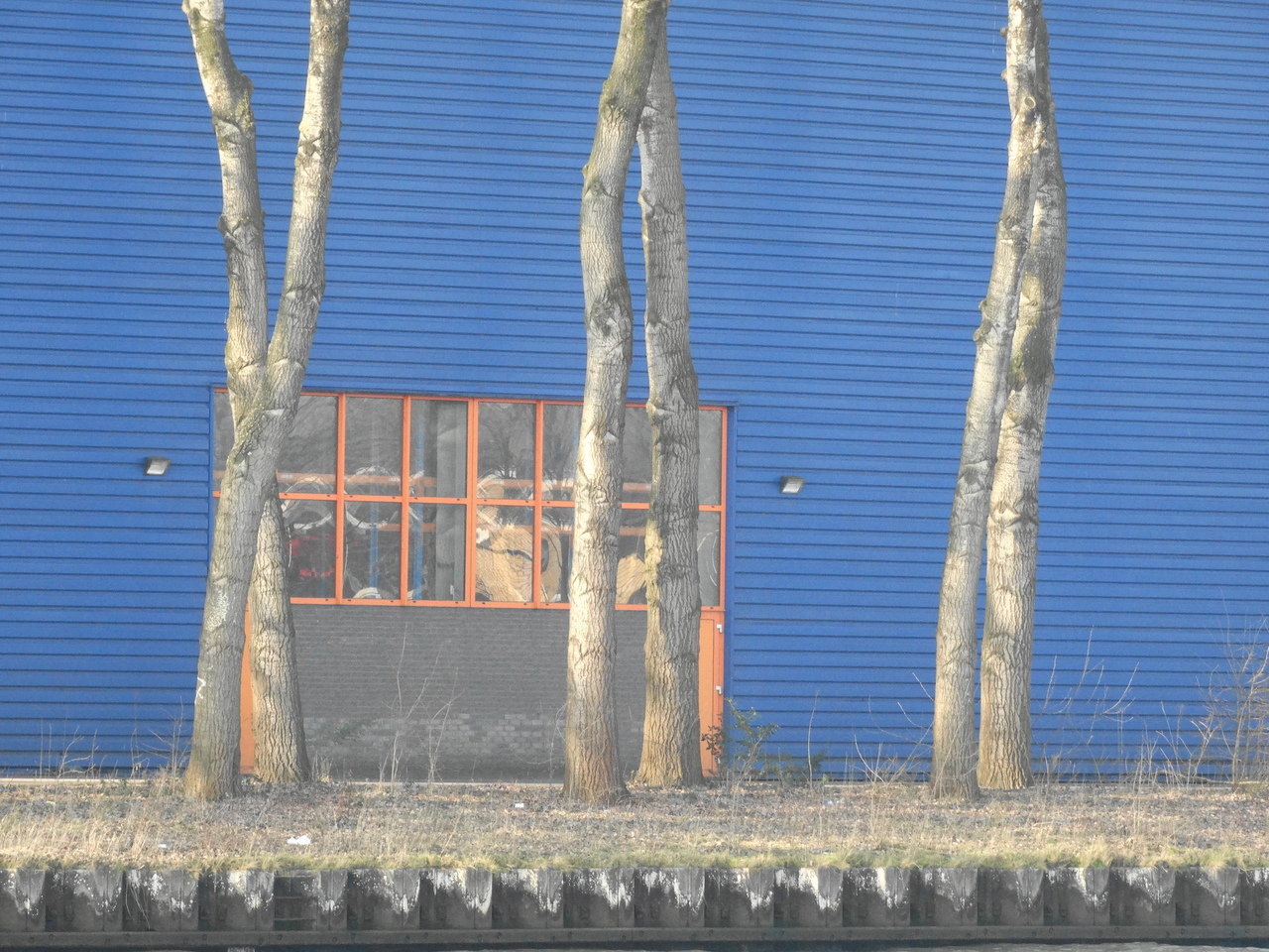 Zes bomen dansen voor twee lampen en 18 ramen, in lijn met blauwe riggels. (Industrie gebied langs Amsterdam-Rijn-kanaal boven Utrecht)