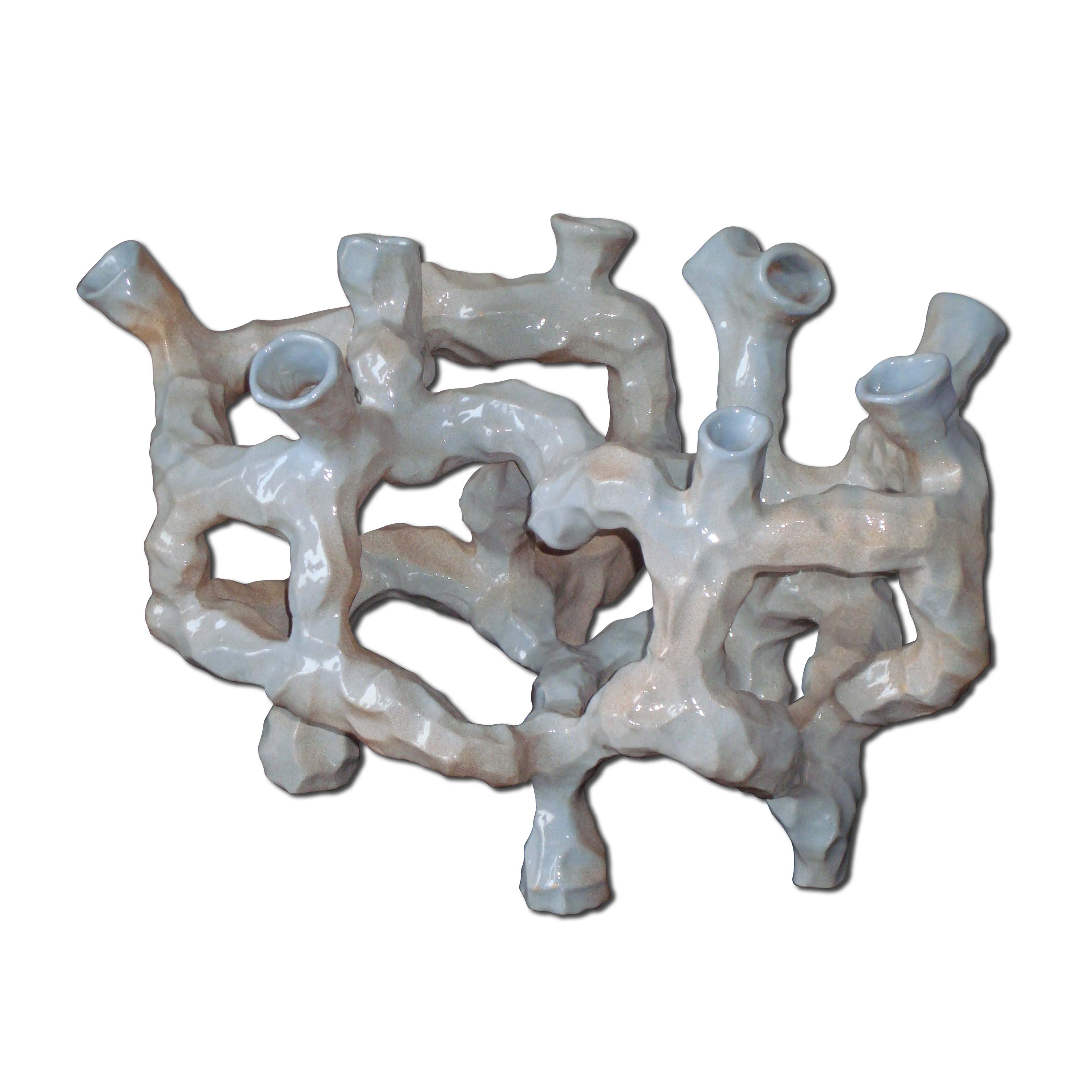 Witbakkende fijne chamotte klei, handmatig opgebouwd uit rolletjes klei. Deklaag: zelf samengesteld gekleurd glanzend glazuur.