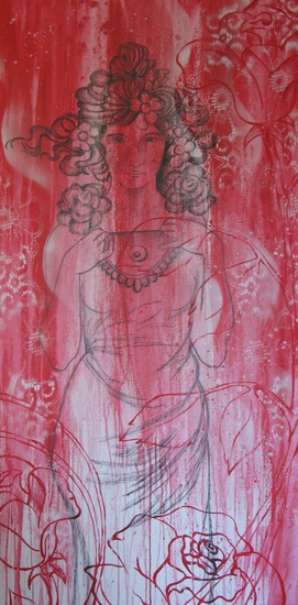 Roos Rose Rozen Roses Mucha Vrouw Rood Jolanda Nabben Venray Acrylverf Doek Inkt Potlood Kant