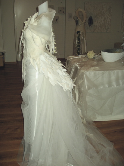 Jurk in samenwerking met Carry Doorn gemaakt. Vilt, zijde en keramiek. Materiaal en vorm versterken elkaar.