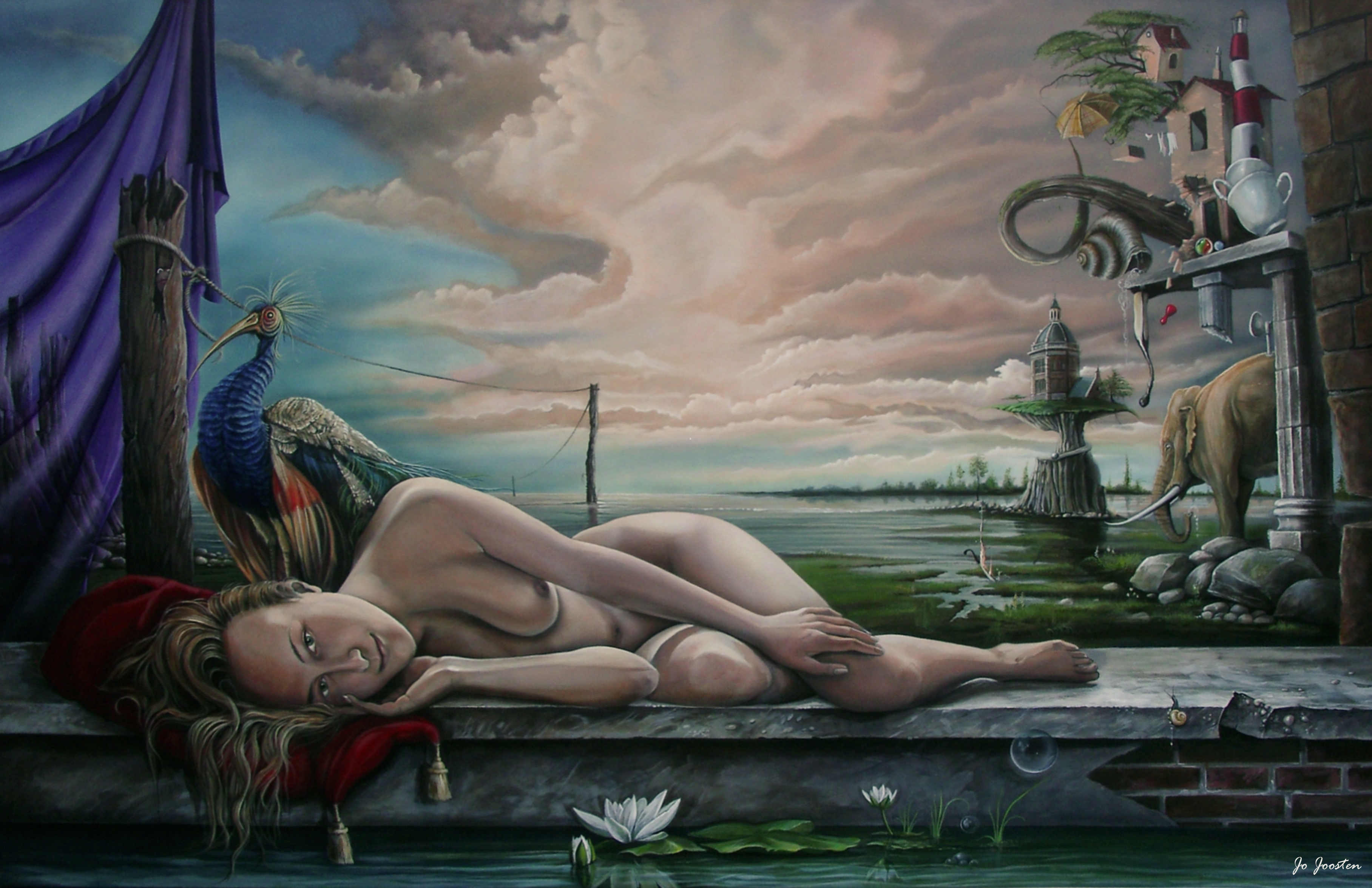 Jo Joosten kunstschilder,magisch realist , surealist,Onwerkelijke en onverwachte situaties in een wereld die gekenmerkt wordt door vervreemding en mysterie.