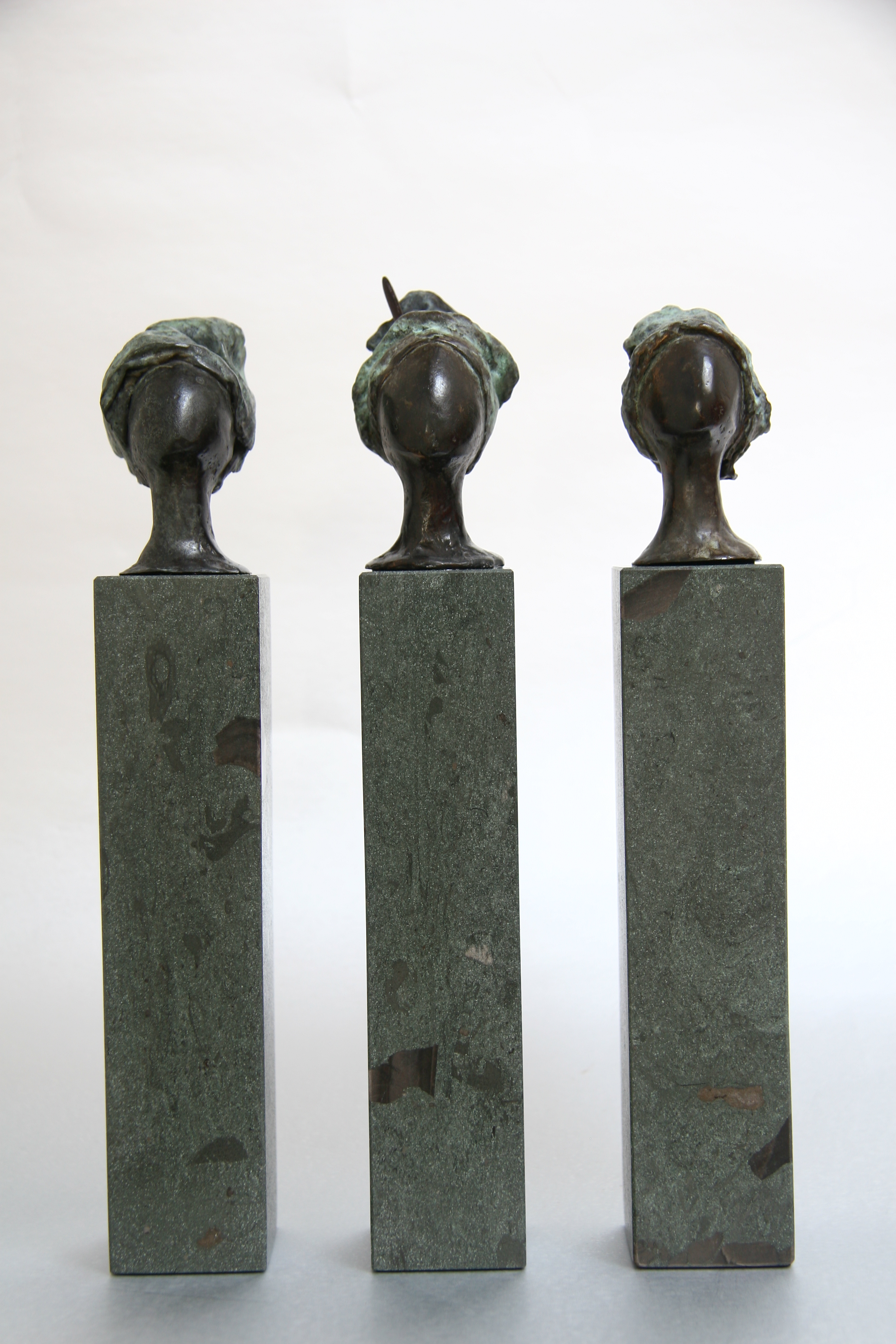 Bronzen kopjes op sokkels van Anrochter dolomiet. De afmetingen zijn inclusief sokkel.