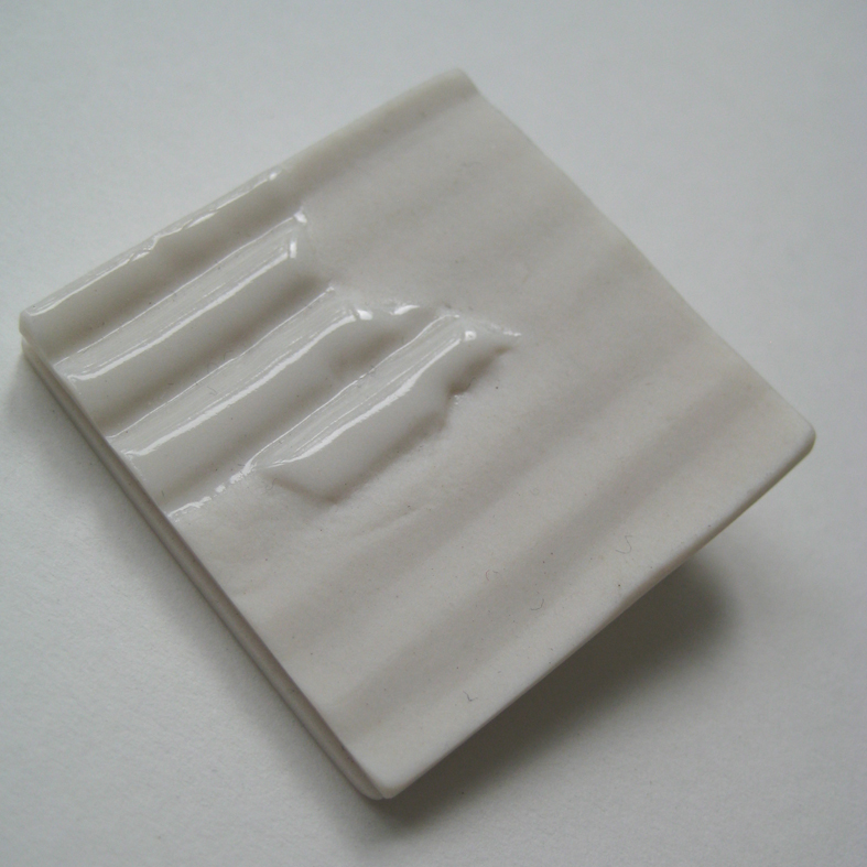Broche gemaakt van 2 lagen porselein, waarbij de bovenste laag bewust met een glooiende beweging. Gedeeltelijk transparant glazuur. Zilveren baret(speld).