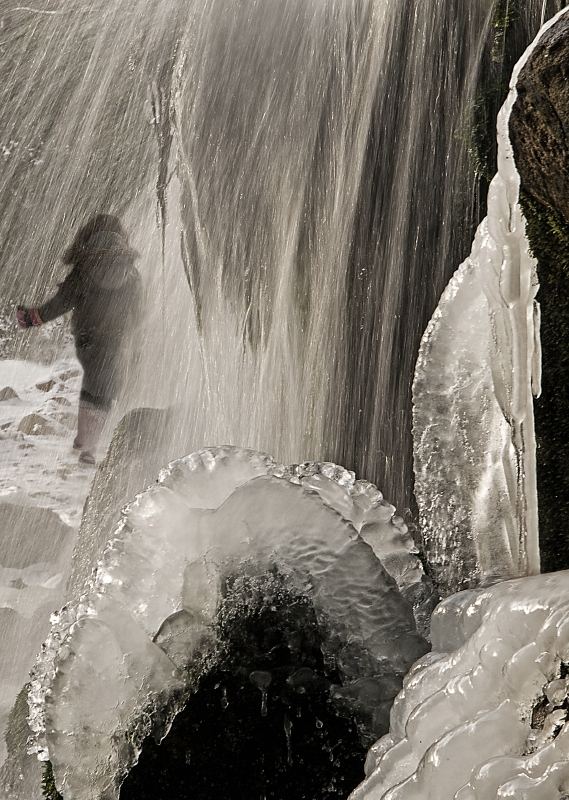 waterval in Arnhem midden in de winter met een spelend kind.