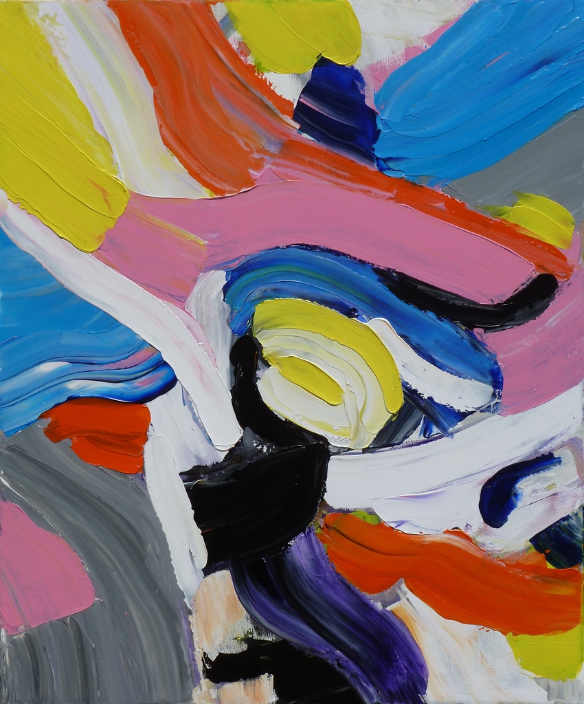 vertrekpunt een "spannende" foto, daarna volledige abstractie en reactie op kleur en vorm schilderijen kunnen ook gedraaid worden ( welke bovenkant vindt je zelf mooier) tegelijk gemaakt met no. 92