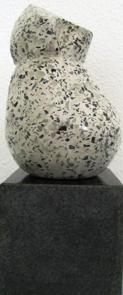 Spits en strak gemaakt van wit cement, groene granito steentjes en glas. Hardsteen sokkel