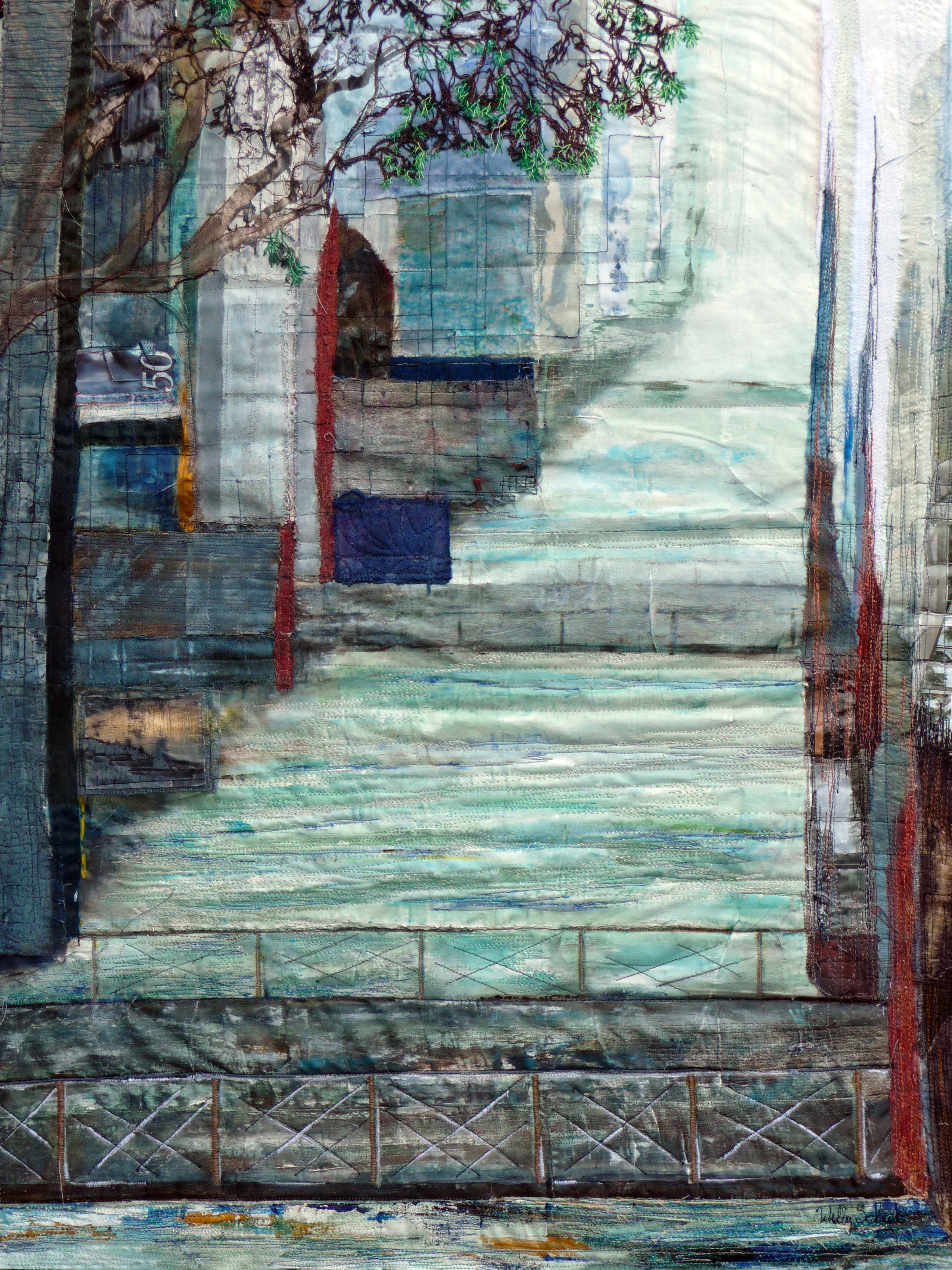 - Bridge over troubled water.-Impressionistisch stadsgezicht in gemengde techniek met o.a. machinaal borduurwerk, verf, papier en textiel.