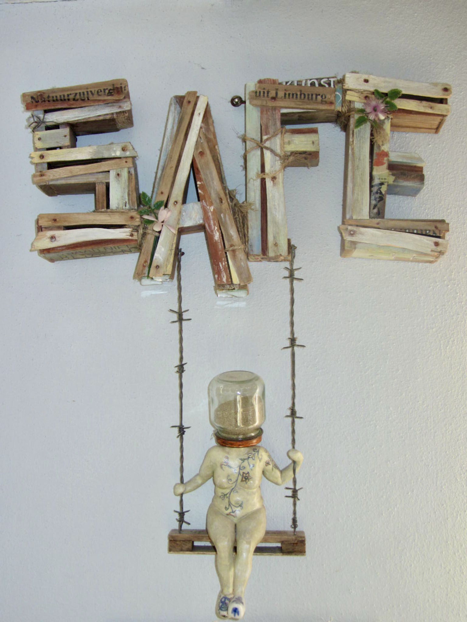 SAFE SAND Met je kop in het zand. De dingen die we niet willen zien, niet willen weten, doen alsof ze er niet zijn. Alles is oke, veiligheid. I (am) Safe... De cultuur van het wegkijken.. (studio schoonmaak, gevonden voorwerpen & klei)