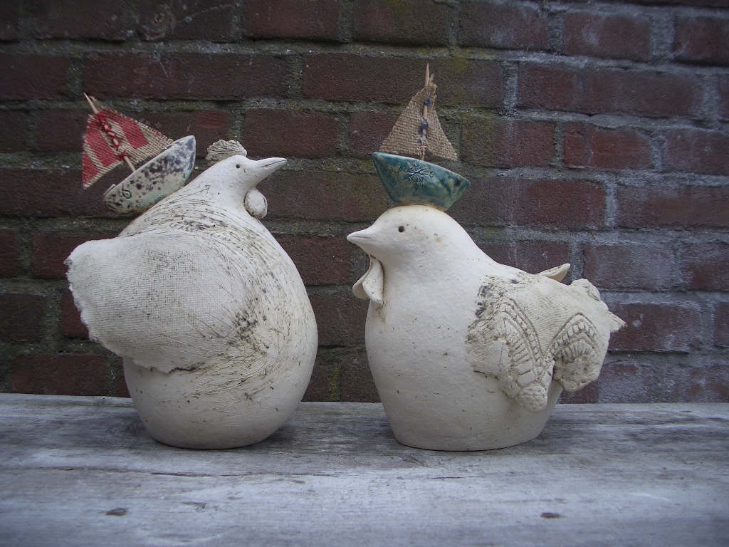 keramiek kippen met boot....handgevormd, oxyden en glazuur.