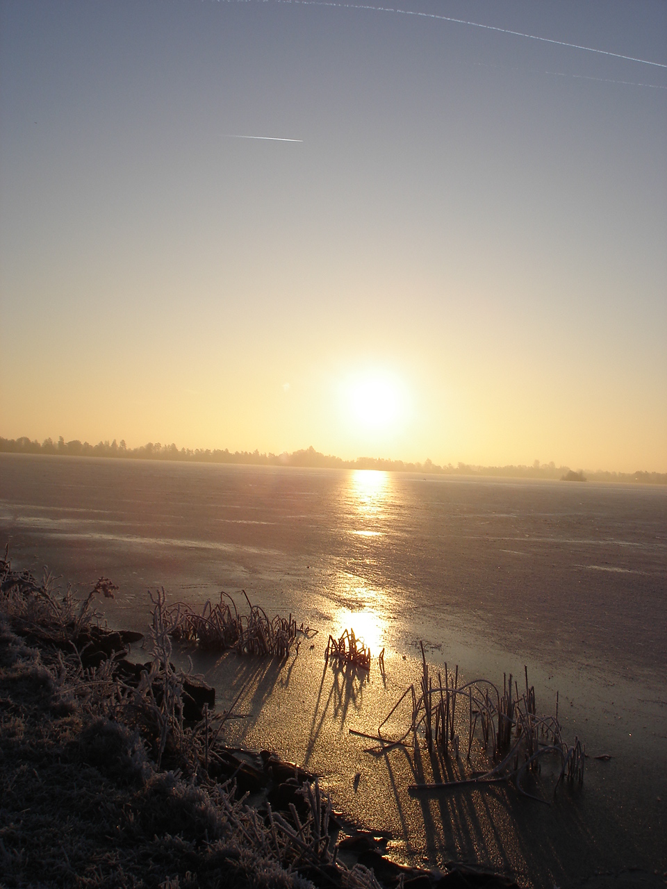 Zonsopkomst boven een bevroren plas.